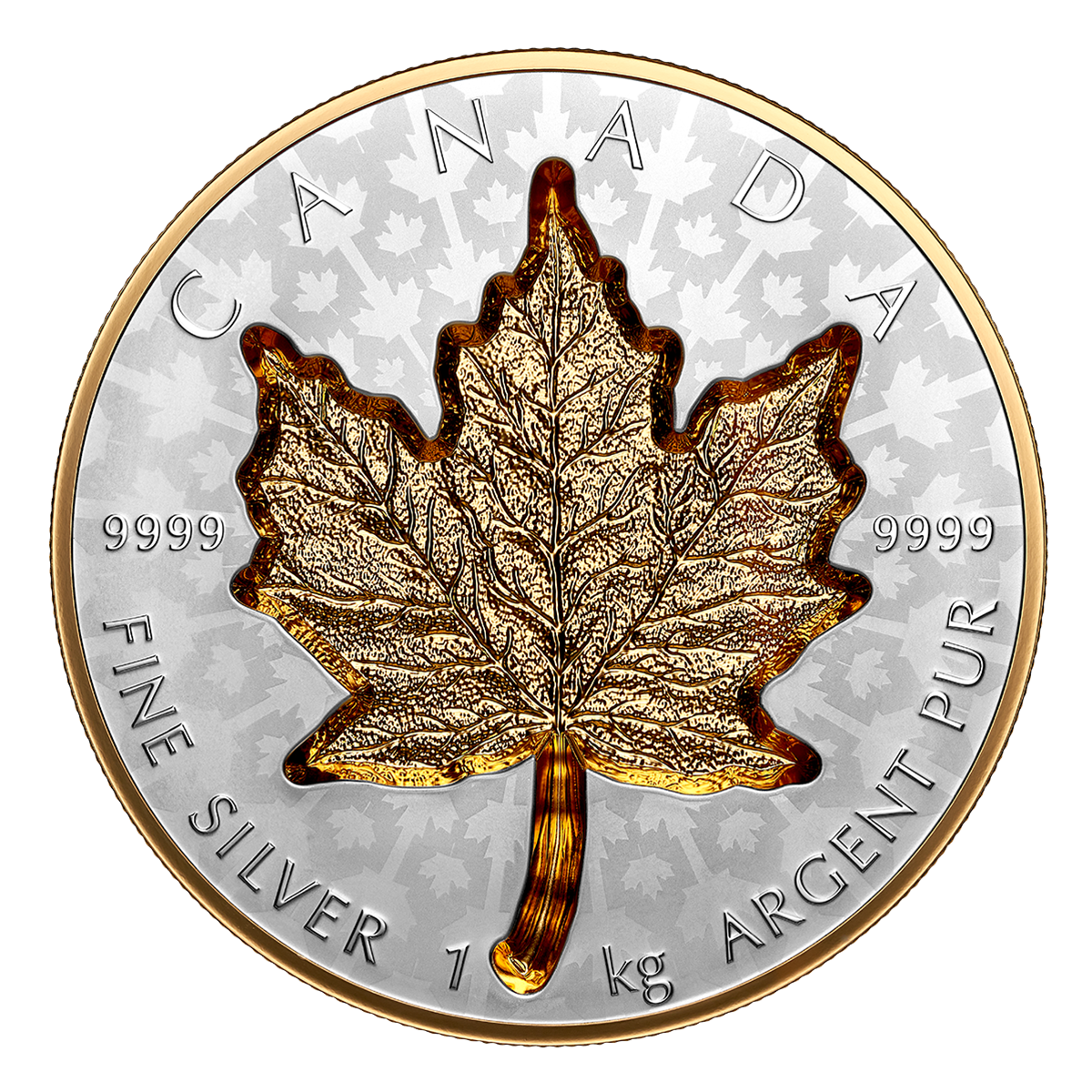Seeing is believing: after taking art to all-new depths on the first Super Incuse Kilo Silver Maple Leaf (SML) coin in 2021, we’re following it up with this showstopper, which features a luxurious metal accent. Yellow gold exudes elegance as it lights up the coin’s namesake leaf, which is struck super-incuse on the reverse. With a typical incuse strike, the maximum relief depth represents roughly 10% of the coin gauge; with a super incuse strike, we’re able to achieve an incredible incuse depth of 4.5 mm – roughly 35% of the coin gauge. To top it off, we incorporated the new “maple burst” field pattern on both sides of the coin, introduced on the 1oz. SML and 2 oz. GML coins launched earlier this year – an added feature that further captures your attention and holds you spellbound!