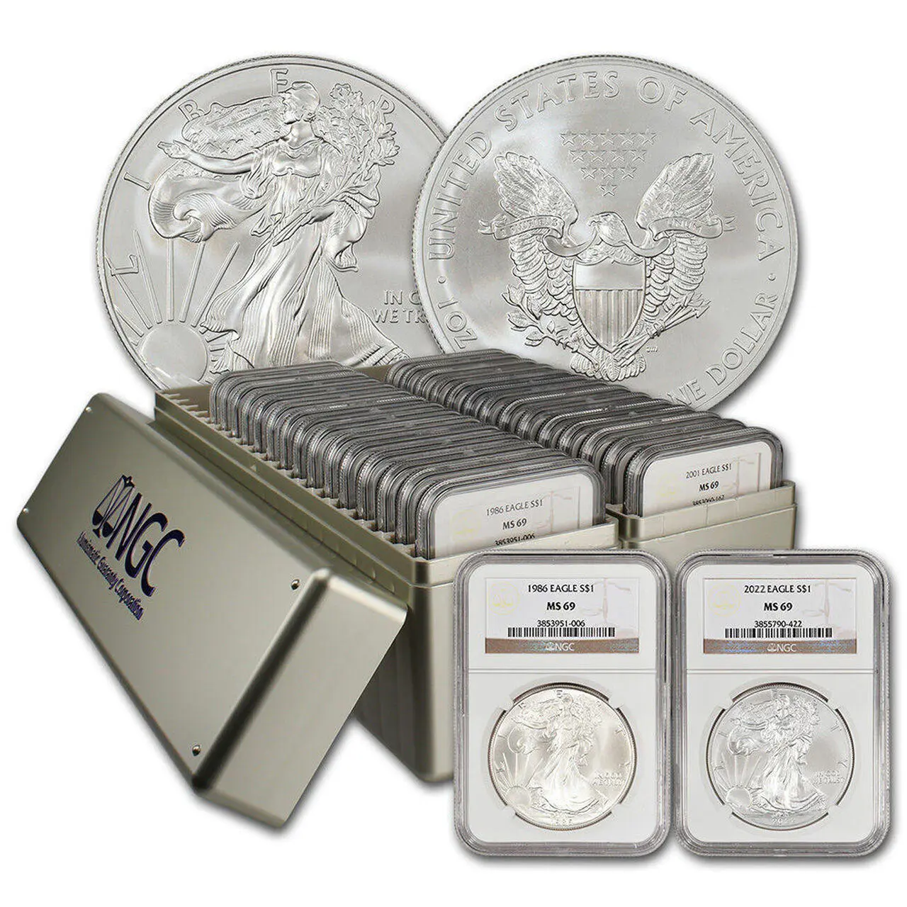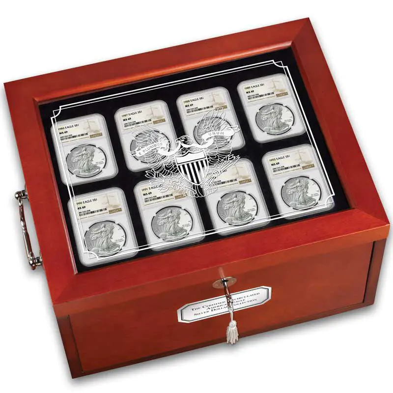Each set comes with two brand new NGC boxes for perfect storage and display. This beautiful American Silver Eagle set was certified and graded by NGC (Numismatic Guaranty Corporation). NGC's encapsulation guarantees the coins MS69 condition. This is one of our most popular collectors sets. Don't miss out on this beautiful American Eagle set.