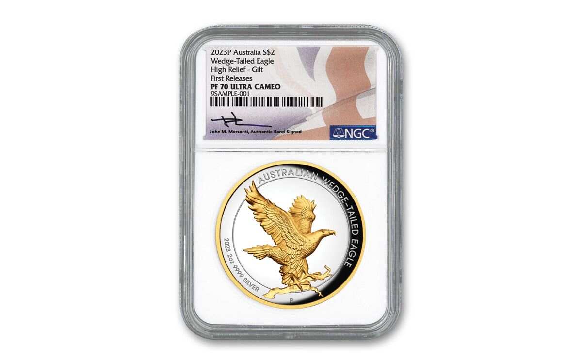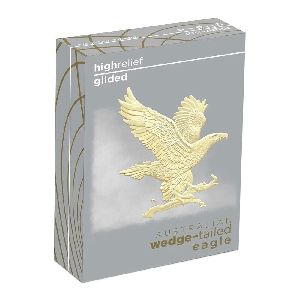 Portraying a wedge-tailed eagle with outstretched wings, the coin is struck in high relief with a superb proof quality finish. Adding further to the coin’s spectacular appearance, the eagle and the coins rims and serrated edge are painstakingly gilded in 24 carat gold. The design includes the inscription ‘AUSTRALIAN WEDGE-TAILED EAGE’, The Perth Mint’s ‘P’ mintmark, and the coin’s weight, purity, and year-date.
