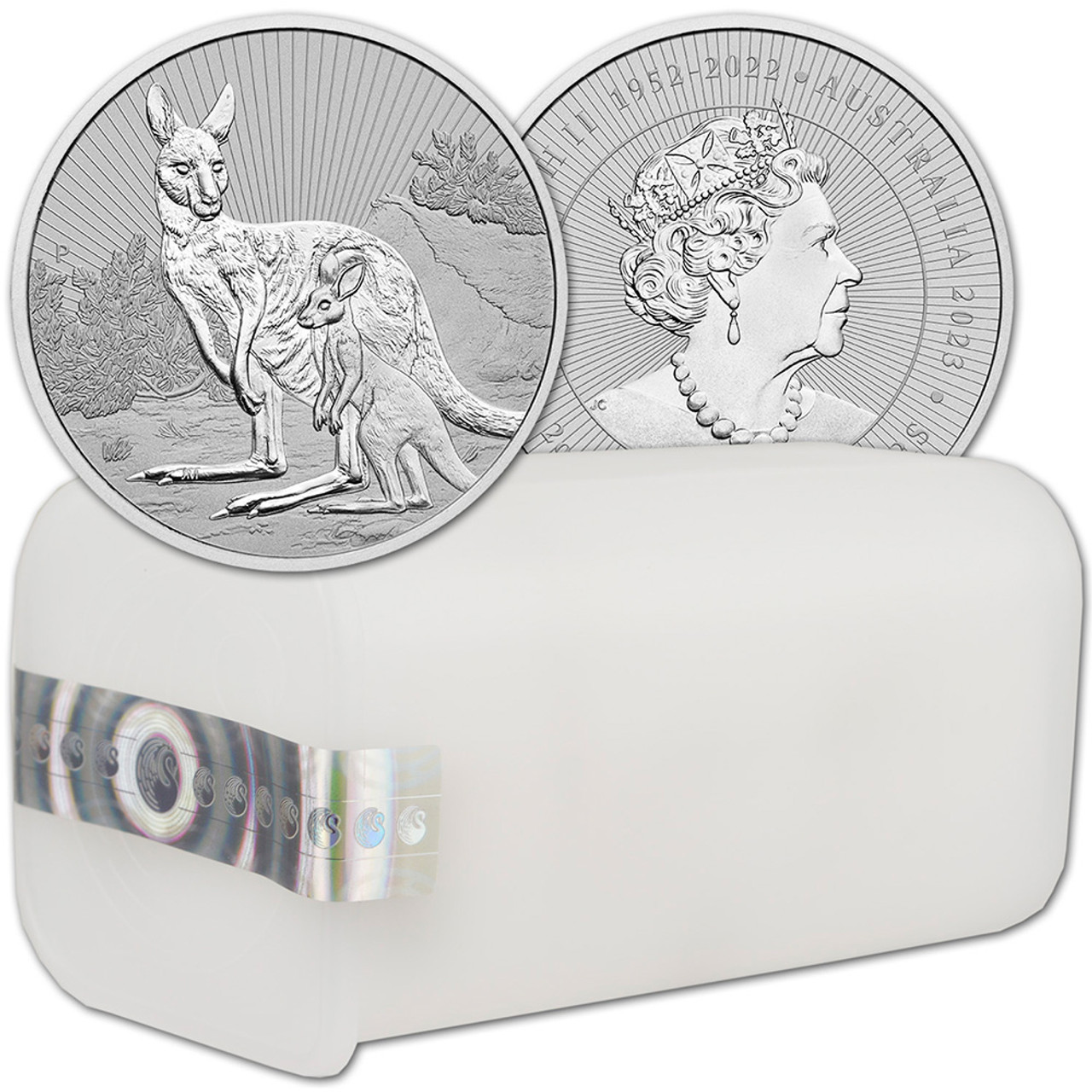 The coin portrays an image of a kangaroo and its joey in scrubland. Included in the design are radial lines suggestive of the setting sun, and The Perth Mint’s ‘P’ mintmark.