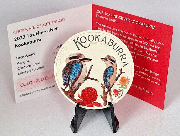 The 34th annual Kookaburra design portrays two birds perched on branches surrounding waratah, a native floral treasure. The design incorporates the inscription ‘KOOKABURRA’, The Perth Mint’s traditional ‘P’ mintmark, the 2023 year-date and the coin’s weight and purity.