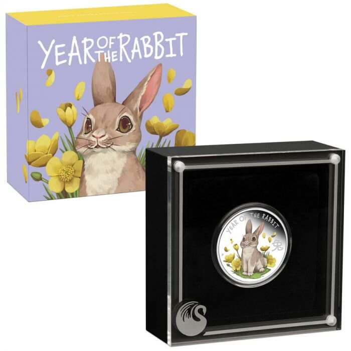 The coin’s reverse portrays a coloured representation of a cute young rabbit in a grassy patch of buttercups. The Chinese character for ‘rabbit’, the inscription ‘YEAR OF THE RABBIT’ and The Perth Mint’s ‘P’ mintmark are also incorporated in the design.