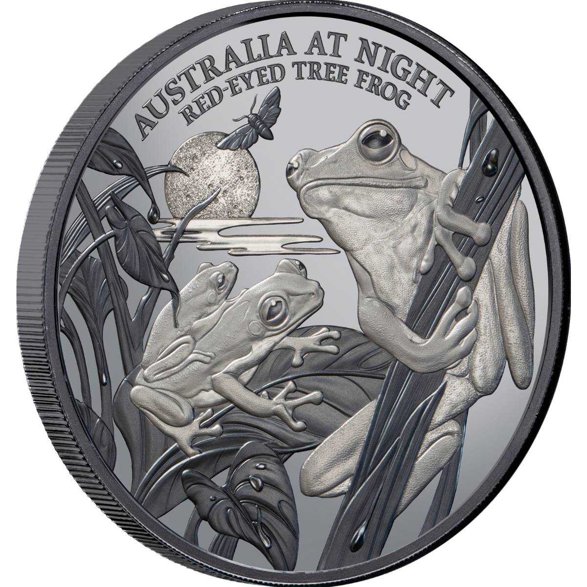 The Red-Eyed Tree Frog 2024 $11oz Silver Black Proof Coin pays homage to the rich biodiversity found within Australia's lush ecosystems. Living predominantly in the coastal regions of northern and eastern Australia, these nocturnal beings spend their days camouflaged among the foliage, coming alive at night with their distinctive calls. Struck from 1oz of 99.9% PURE SILVER, three glistening tree frogs are eye-catching against the inky Black Proof finish of the reverse, under the light of the silver moon.