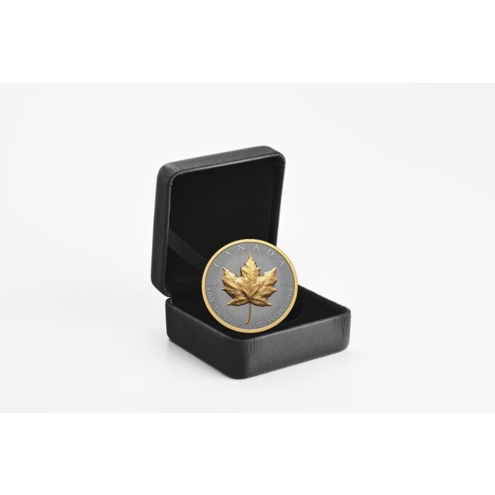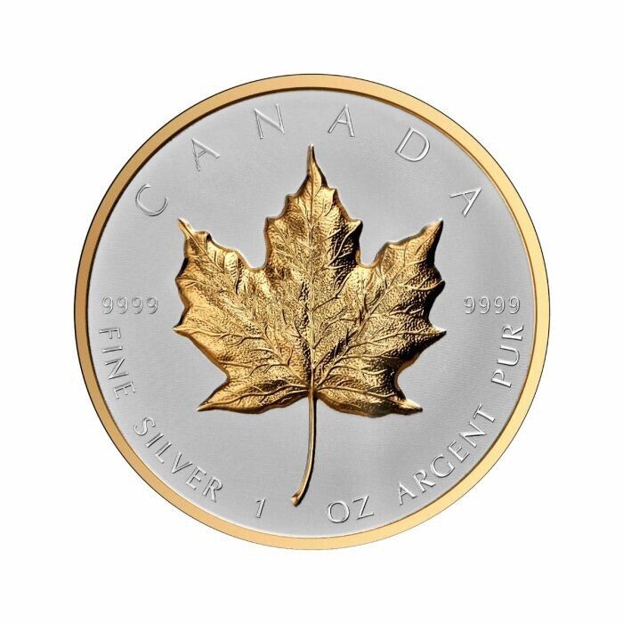 Reverse: A meticulously detailed sugar maple leaf is beautifully sculpted in gold-plated ultra-high relief on the reverse. Surrounding inscriptions include "CANADA" and "FINE SILVER 1 OZ. ARGENT PUR," with the coin's purity of "9999" located on each side of the leaf.