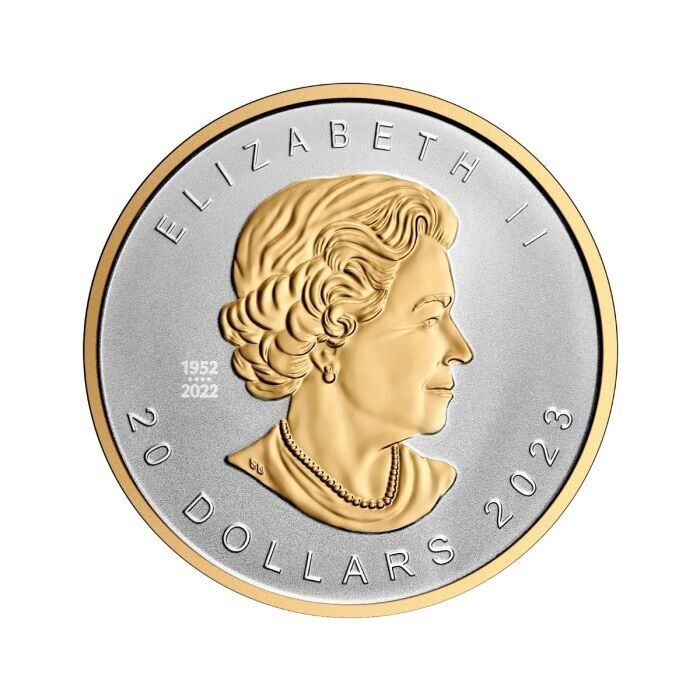 Obverse: An effigy of Her Late Majesty Queen Elizabeth II is majestically plated with gold on the obverse. This likeness of Great Britain's longest-reigning monarch was created in 2003 by renowned Canadian portrait artist Susanna Blunt. The delicately frosted natural silver field is inscribed with "ELIZABETH II," "20 DOLLARS," and the date of issue "2023." The four small aligned circles, along with the dates "1952" and "2022," that is positioned beside the late monarch, are a tribute to her historic seventy-year reign and the four different renditions of the Queen that appeared on Canadian coinage.